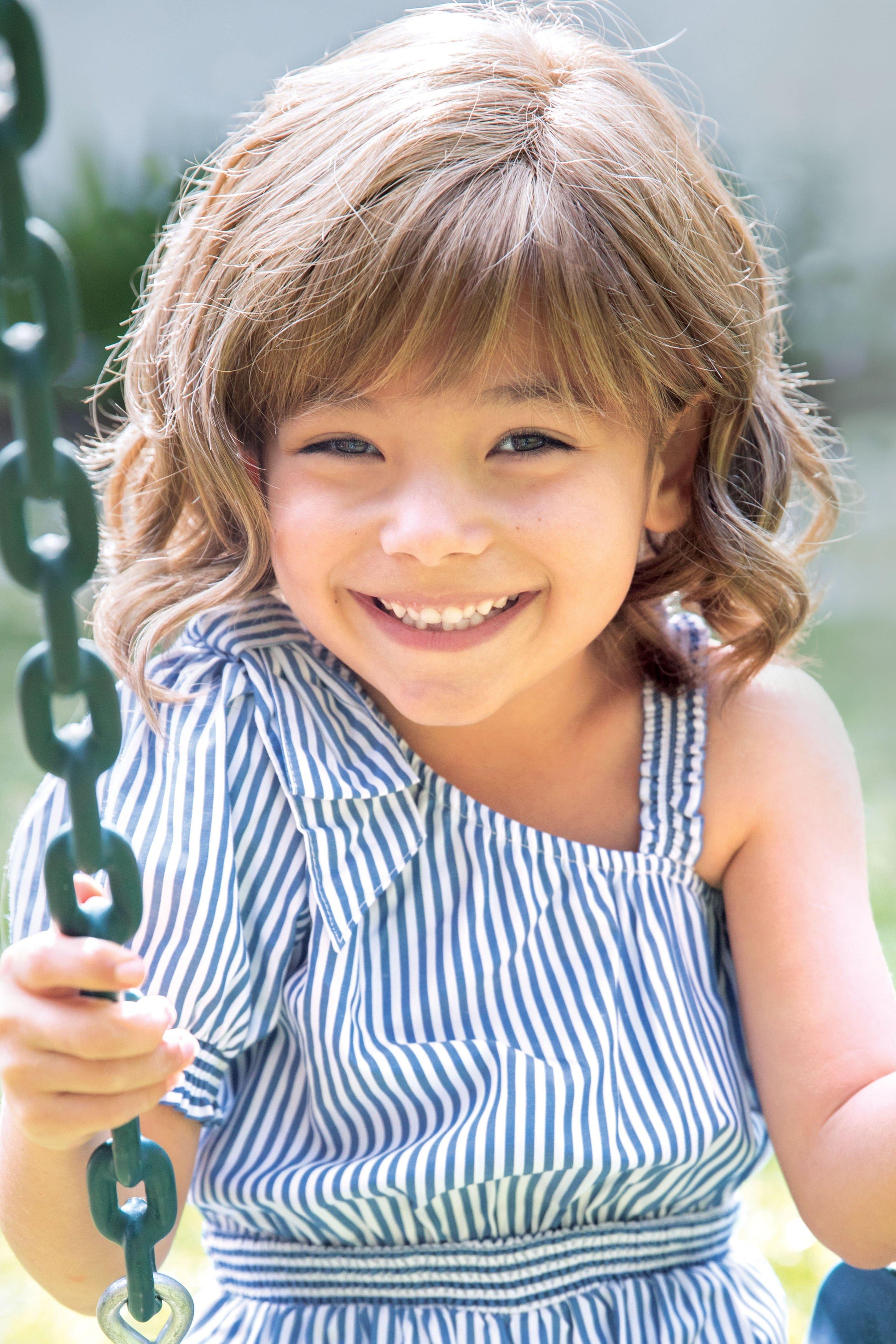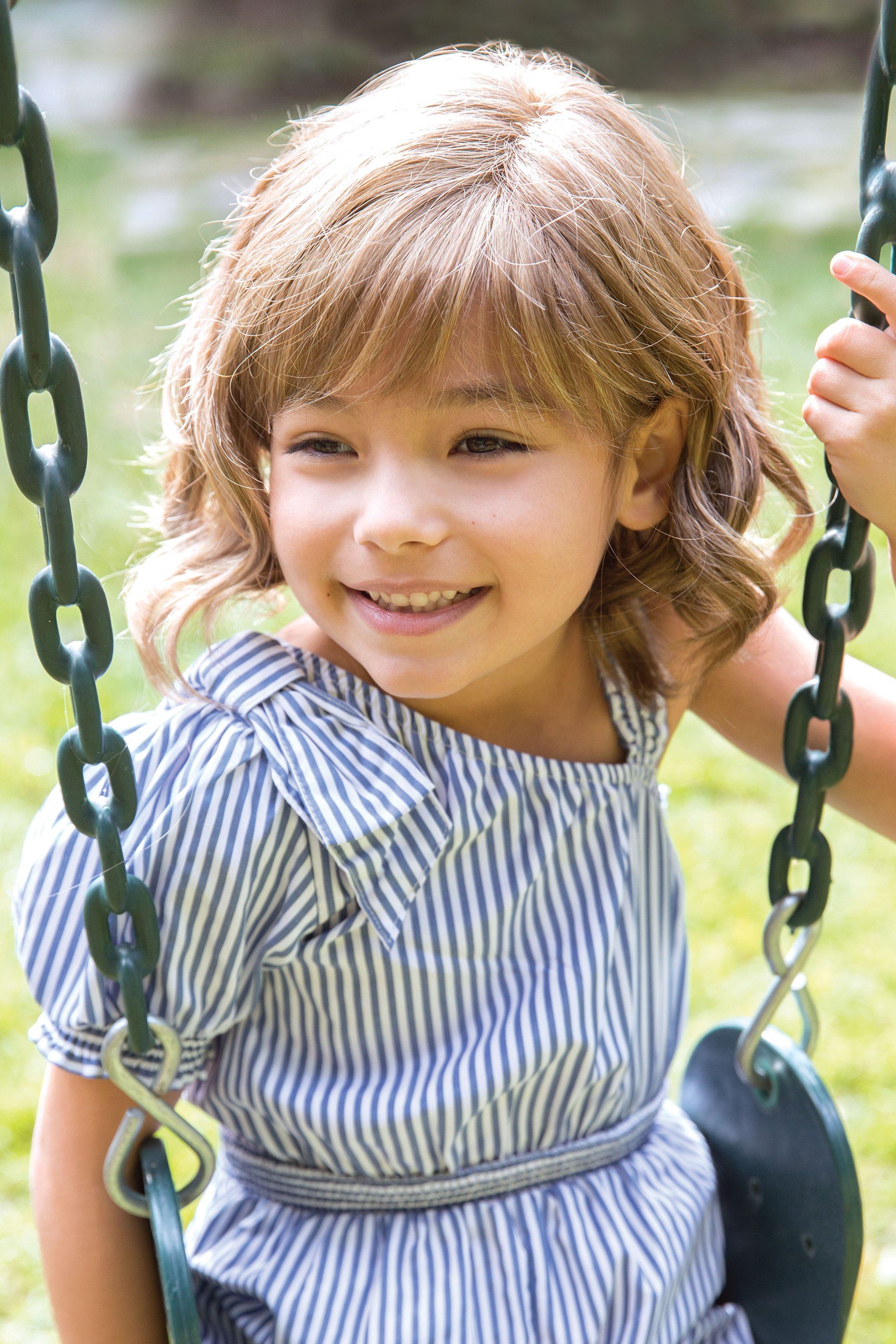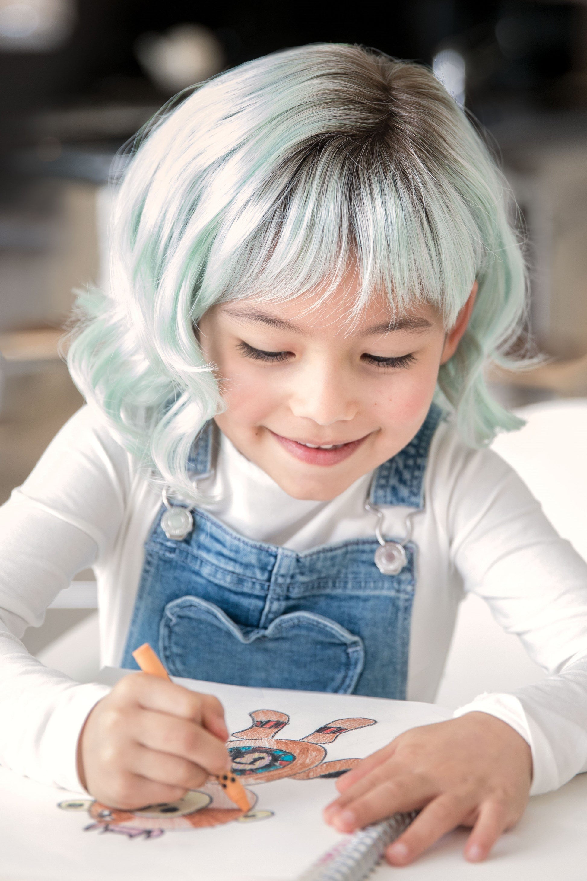 This wavy ready-to-wear wig is a playful bob with light wispy bangs. Our children's lace front with lace cap wigs are light weight. comfortable. wefted and with an invisible hairline for ultimate comfort. The cap includes lace front plus lace part with full monofilament top covered by soft material with elastic lace that allows cap to stretch for more flexibility.