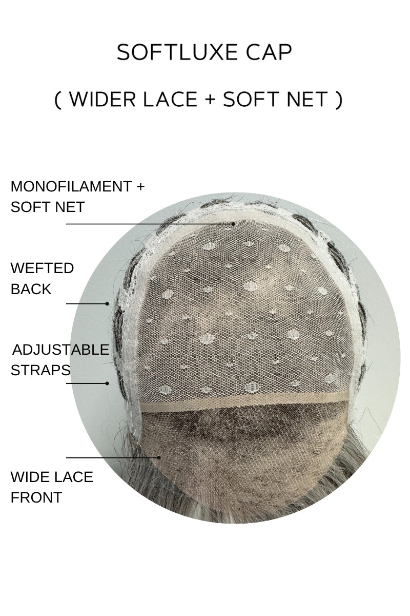 SoftLuxe Cap: This cap features a wide lace front and a soft net monofilament top. for a more delicate and durable feel while maintaining the same breathability as other caps. Natural Movement Hair Fiber: A combination of high-quality synthetic and heat-friendly hair fiber. creating a natural. subtle shine. Please note that this is a blended fiber piece and should not be treated like a heat-friendly piece but instead as a normal synthetic.