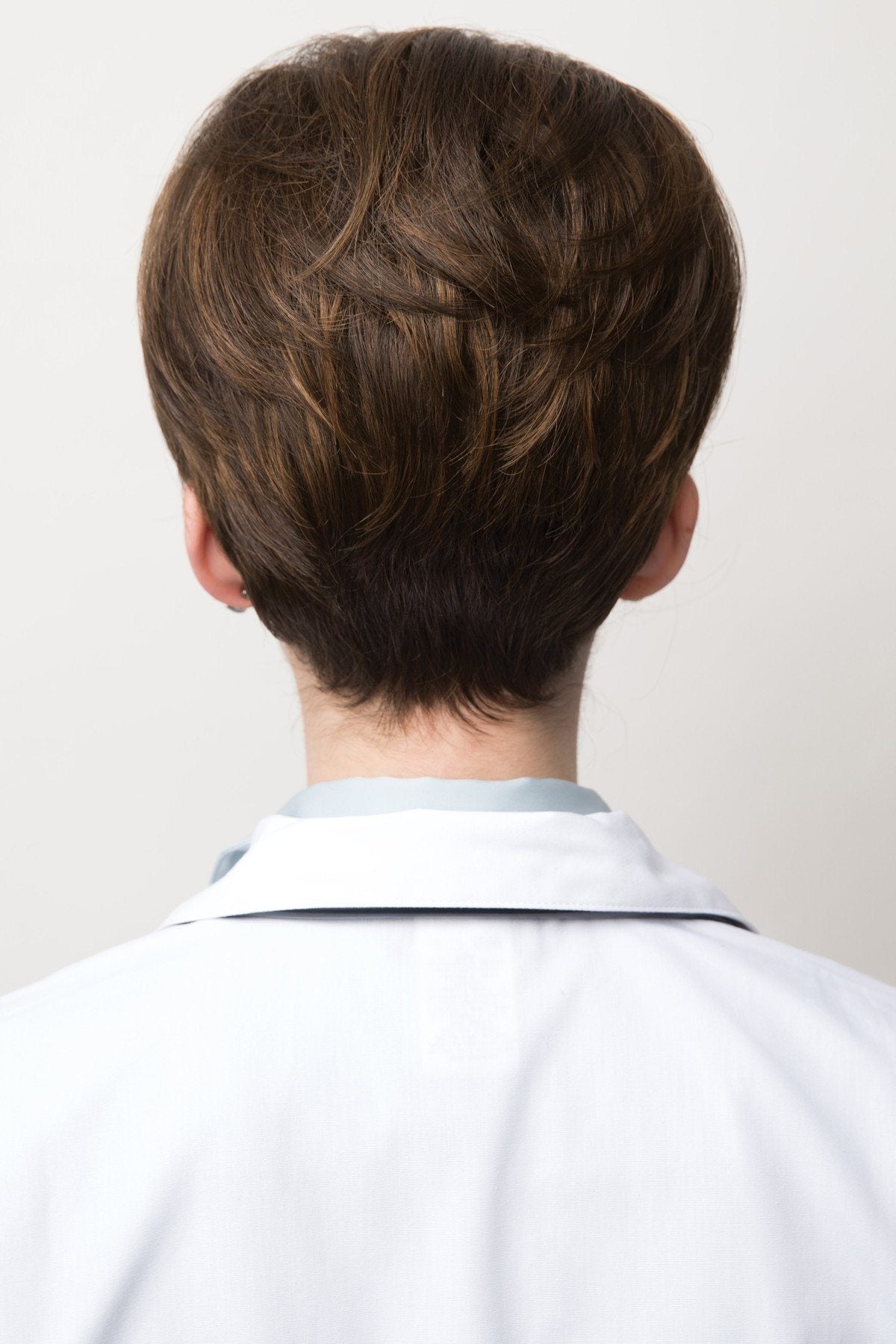 The wig features a double monofilament top. lace front. and 100% hand-tied construction. making it both stylish and comfortable to wear. It has a flattering. tapered design and a long asymmetrical fringe. adding a touch of elegance. With its short length and straight texture. it's perfect for anyone looking for a sleek and chic hairstyle.