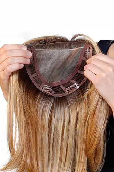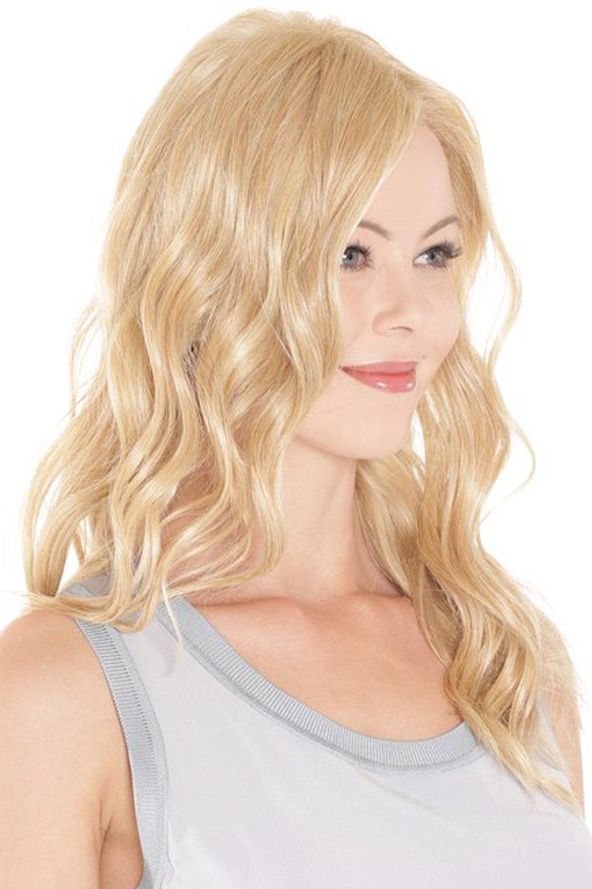 The famous Lace Front Mono Top in a modern beach wave. 18 inches long. luxurious hand pulled strand-by-strand full monofilament hairpiece that gives the effect of a full cap wig. Enjoy the comfort and lightweight of deluxe full lace front hairpiece. Added extra 4 layer of hair in the back of the piece gives just a little more volume and coverage without wearing a full wig. Beautiful modern curls flowing naturally can be yours anytime without using the curling iron or the rollers. Built in snap clips make it easy to secure. Perfect for adding the volume to the crown and natural texture to frame the face.