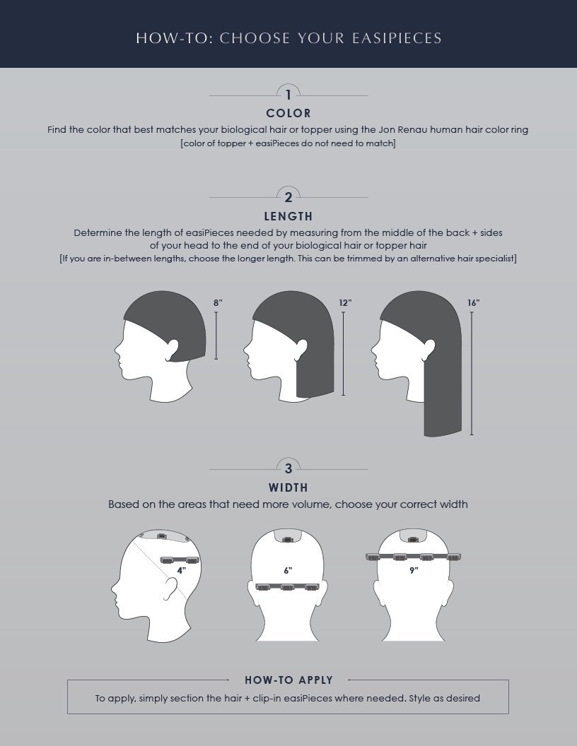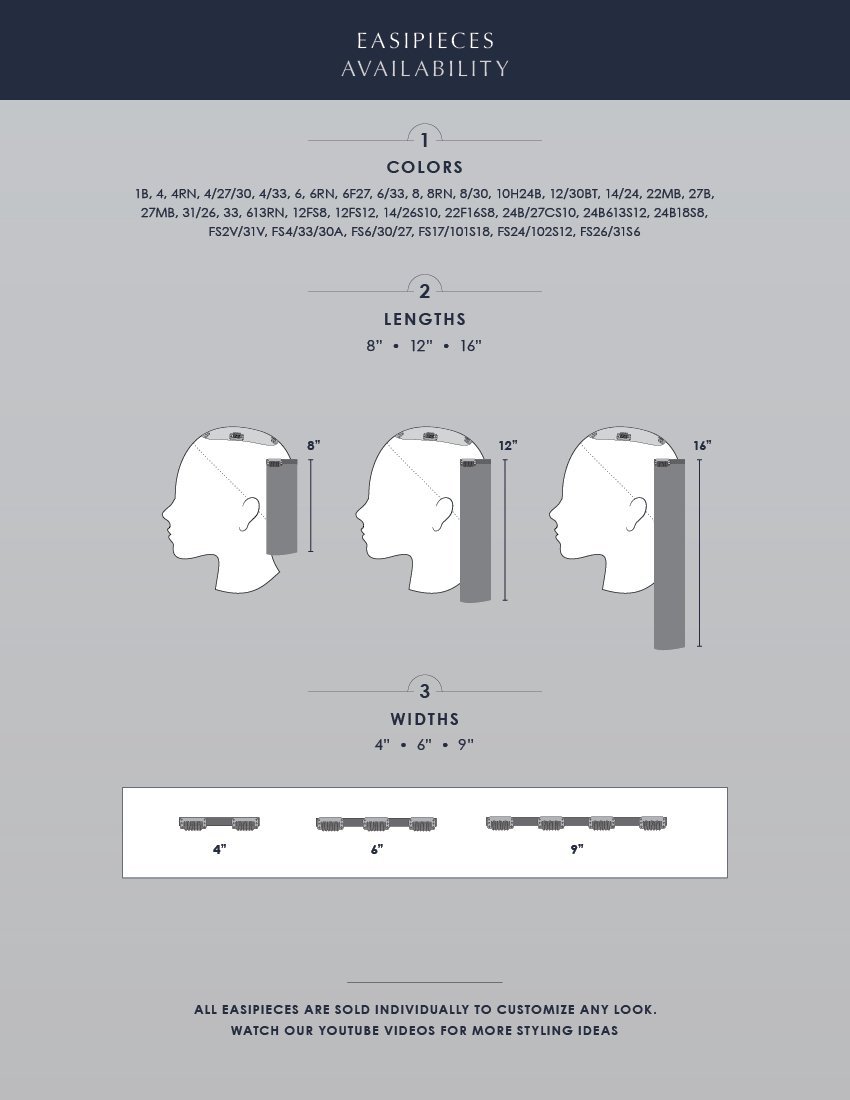 – easiPieces are available in three hair lengths: 8". 12" & 16" and widths: 4". 6" & 9" –