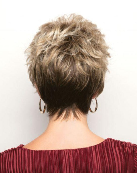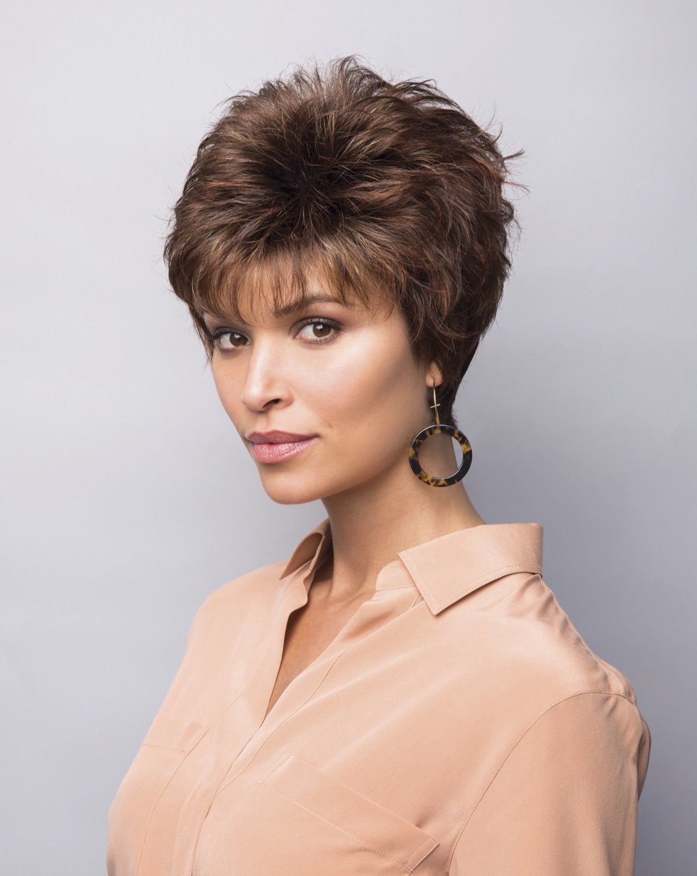 Drew from the Noriko Collection is an overall spiky layered wig and is designed with a chic cropped nape and perfect volume at the crown. Make a bold statement in this short. "edgy" pixie cut wig.