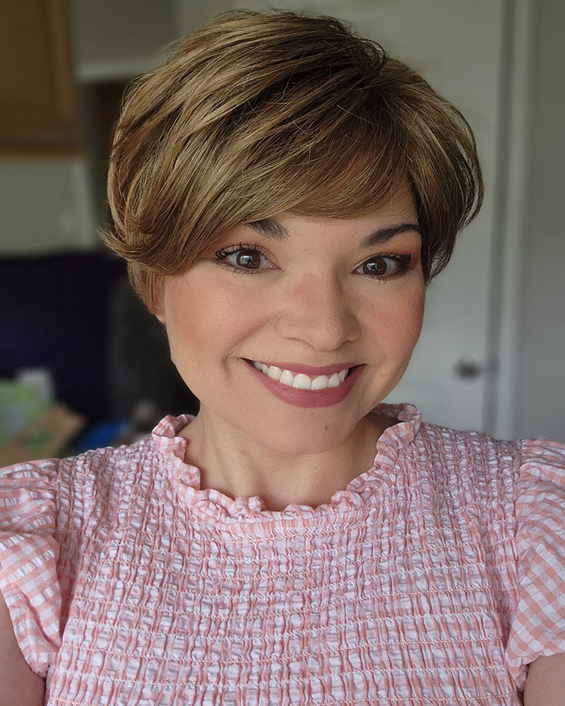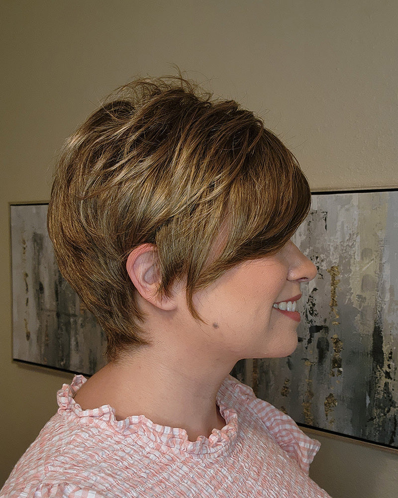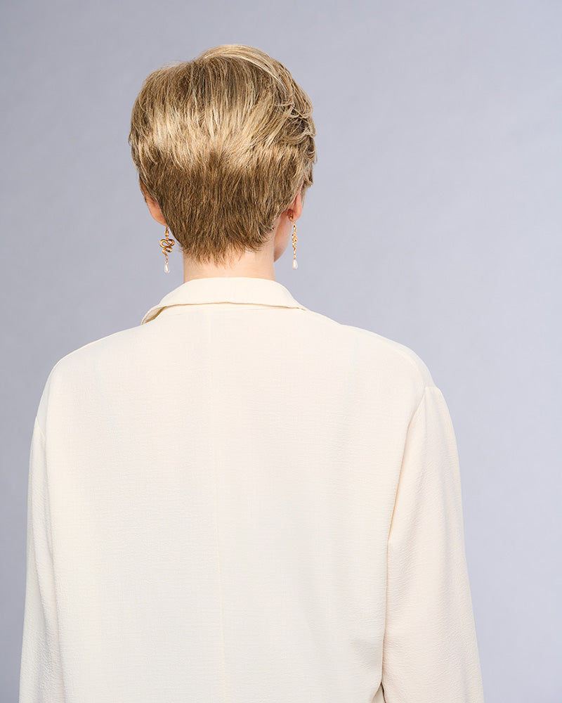 Get ready to dance the night away in this gently waved short crop. Soft layering throughout. an asymmetrical tapered bang. and its closely cropped nape will have you stepping out in style.