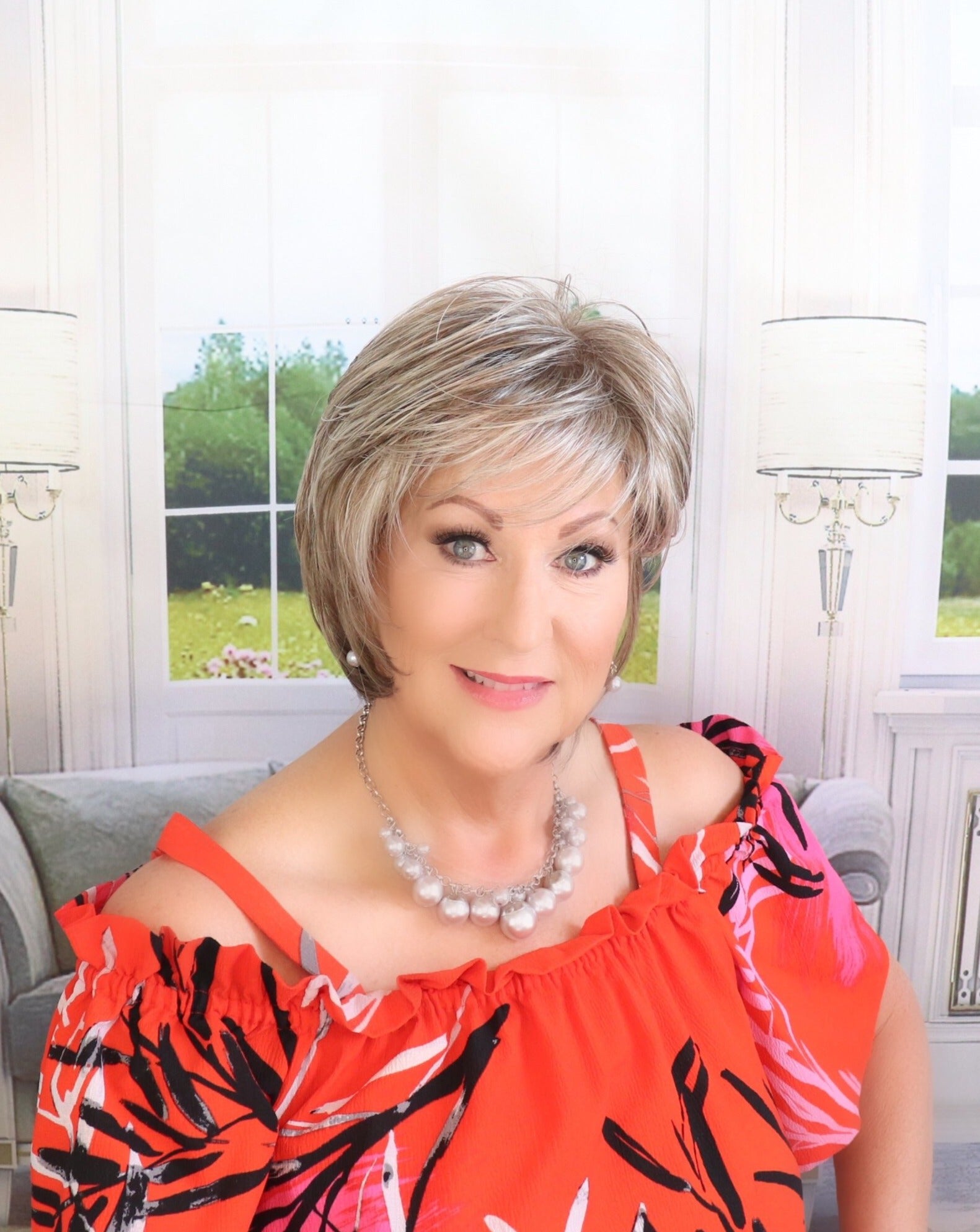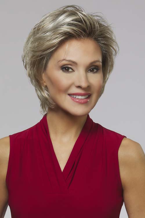 Michele is a short layered style with wispy bangs and a monofilament top with a lace front.
