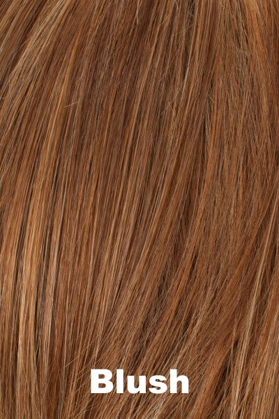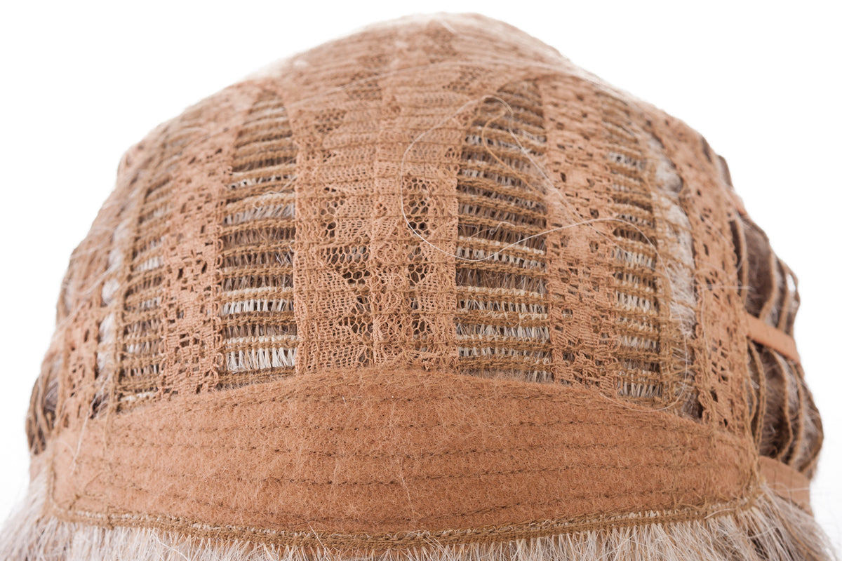 Wig with long loose curls bursting from a smooth crown with soft bangs.