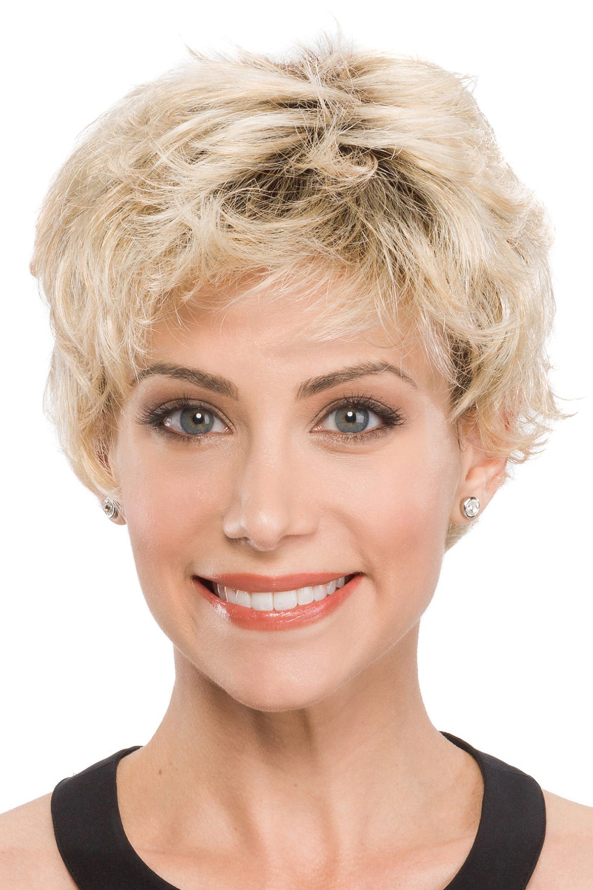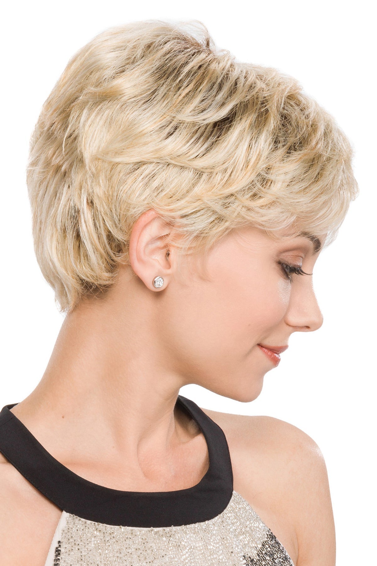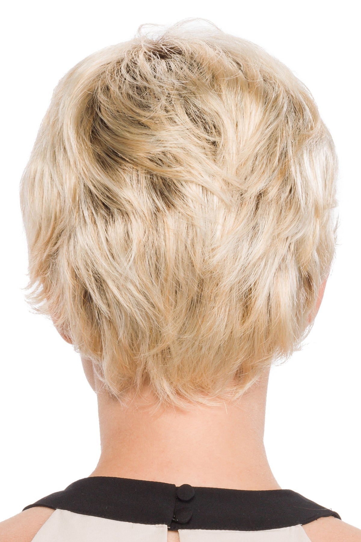 A perfectly layered short style wig with pliable soft curves. Simple and easy to wear. shake and go. This style can be worn flirtatiously spiked up. dramatically smooth or naturally finger tousled.