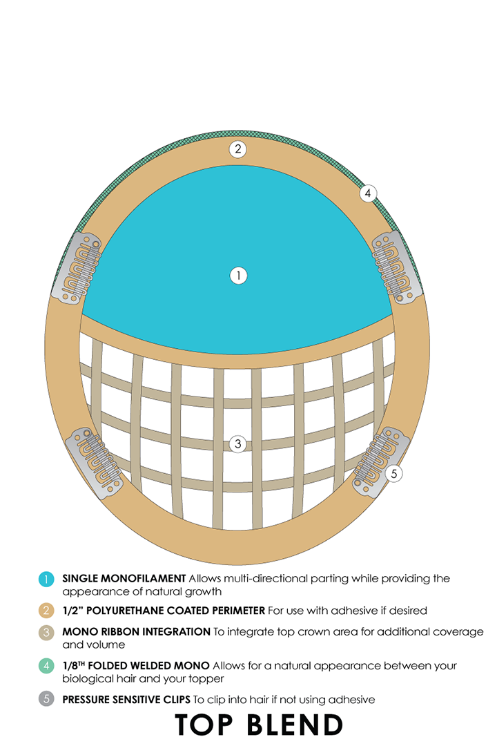 Top Blend was constructed to enhance coverage and volume in the crown by integrating your own hair for a supremely natural look. She features premium Remy Chinese human hair. ideal for those experiencing beginning to mid/progressive hair loss. This topper features a single monofilament base. durable mono ribbon integration at the back. and an all-around polyurethane-coated perimeter with four strategically placed pressure-sensitive clips.