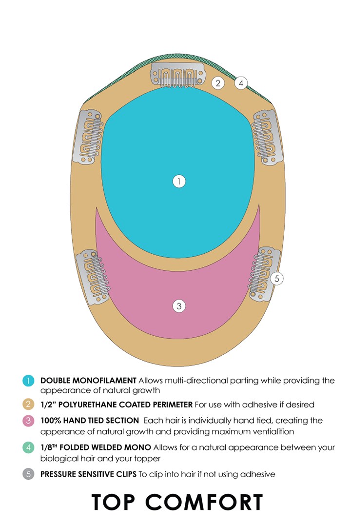 Designed with comfort as the top priority. Top Comfort is made with a double monofilament top. silky smooth to the touch. and a hand-tied back for the most natural movement. Featuring premium Remy Chinese human hair. Top Comfort is ideal for those experiencing beginning to mid/progressive hair loss and looking for more coverage in the top and crown areas. This topper features a double monofilament base. hand-tied back. and an all-around larger polyurethane perimeter with five strategically placed pressure-sensitive clips that can be removed if Tape 'N Go or adhesive is applied.