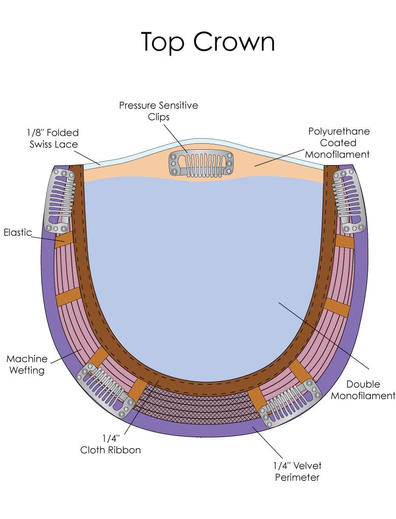 This undetectable synthetic crown volumizer clips in gently and blends seamlessly with short wavy styles. The translucent monofilament base allows multidirectional styling. Top Crown is for beginning to mid/progressive hair loss and the hair texture is wavy/curly. The base measures 6.75" x 6.5". Hair length of Top Crown is 5.75" -6'.