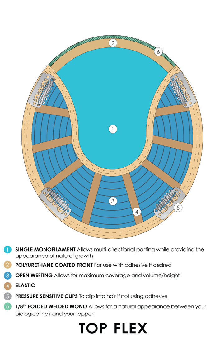 Top Flex is made with premium Remy Chinese human hair. ideal for those experiencing beginning to mid/progressive hair loss and looking for coverage that blends seamlessly for a natural look. This topper features a single monofilament base. machine wefting perimeter for maximum coverage. polyurethane coated front. and a perimeter with four strategically placed pressure-sensitive clips.