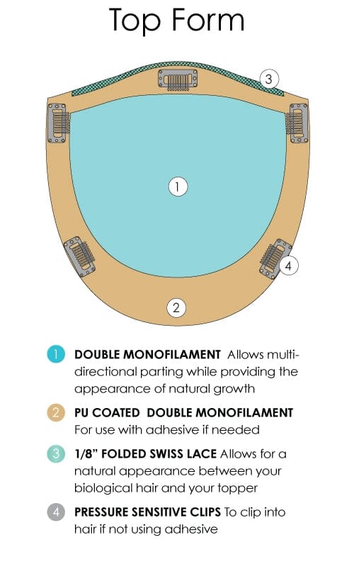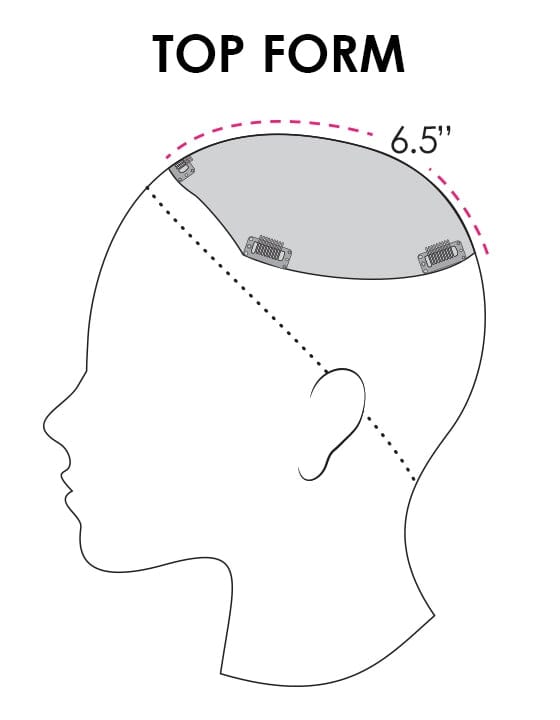 Top Form 6" - 8" topper by Jon Renau is a new shorter version of Top Form which comes in 12" and 18" hair lengths as well. This clip-in Remy Human Hair volumizer is perfect for those with beginning to mid/progressive stages of hair loss. Top Form is designed to give volume at the crown and can be heat styled for either a curly or straight look. Details:Hair: Remy Human HairHair Length: 6-8" Weight: 2.1ozHair Style: StraightBase Dimensions: 6.5" x 6.5"Base Design: Double Monofilament with PolyU Perimeter