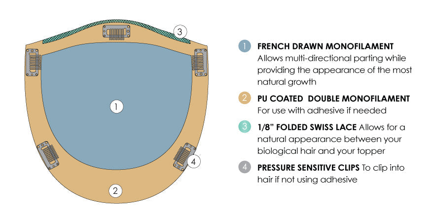 This Remy human hair topper clips in easily behind the hairline while adding gorgeous all-over volume at the crown. Each hair is hand tied to a Swiss lace using French knotting. a luxury invisible knotting technique that results in a superior natural appearance. With length falling below the chin and a larger base. this French top hair topper provides thorough coverage for the mid/progressive stage of hair loss. Top Form French is available in 12 and 18 inches hair lengths.