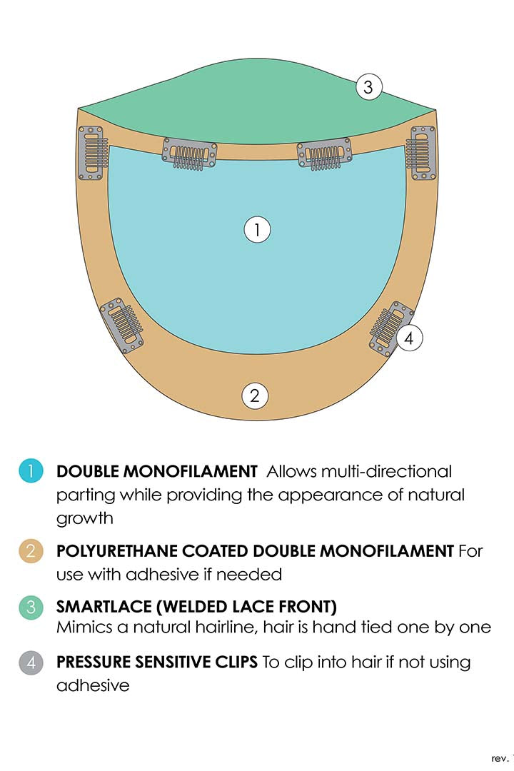 Crafted with 100% Remy human hair. the Top Form Lace 14” offers luxurious texture and styling versatility in a discreet. lightweight topper. Designed for seamless integration. it features a temple-to-temple SmartLace lace front that mimics a natural hairline. eliminating the need to blend your natural front hairline. Graduating density transitions from a light front to medium coverage at the crown and back. providing a flawless. natural look. Perfect for mid-progressive hair loss. the 14” length is ideal for achieving subtle volume and movement.