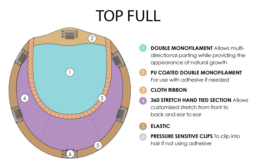 Designed for the advanced stage of hair loss. this one-piece hair topper features an 11.5" x 11"-base that adds volume over the entire crown. Top Full is available in 12" and 18" hair lengths. as well as synthetic and Remy human hair.