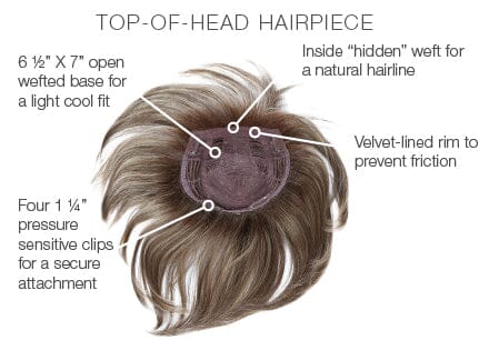 Top Perfect is a synthetic hairpiece that blends well with mid-length to longer biological hair. Top Perfect is a synthetic topper that conceals thinning crown areas and attaches to the top of the head with 4 pressure sensitive clips. The base size is 6.5" x 7" and has an open wefted base for a light. cool fit. Hair lengths: Front: 10” Crown: 10” Side: 9” Back: 9”