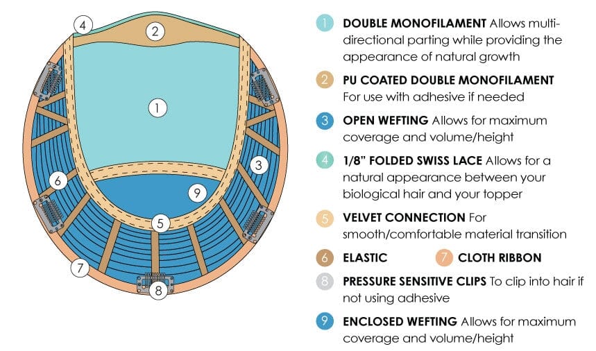 Cap Construction: | Monofilament Top (Double Monofilament). Wefted |