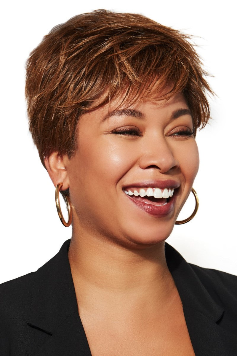 The Brushed Pixie Wig is a high energy cropped haircut with a smooth wave that frames the face with bangs of volume on top and our Cool Comfort™ cap for every day. all day comfort.