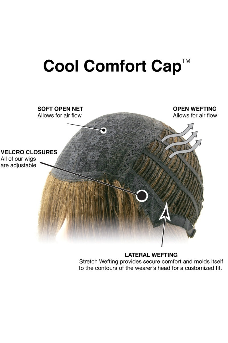 A low density brushed up top with tapered sides and back. Special pre-teased roots provide lift without any bulk or fizziness. Long enough to brush over or behind your ears and adjustable ear tabs for just the right fit. TressAllure's Cool Comfort Cap® fits like a dream. Soft. aerated. light and it molds itself to the contours of your head for a secure customized fit.
