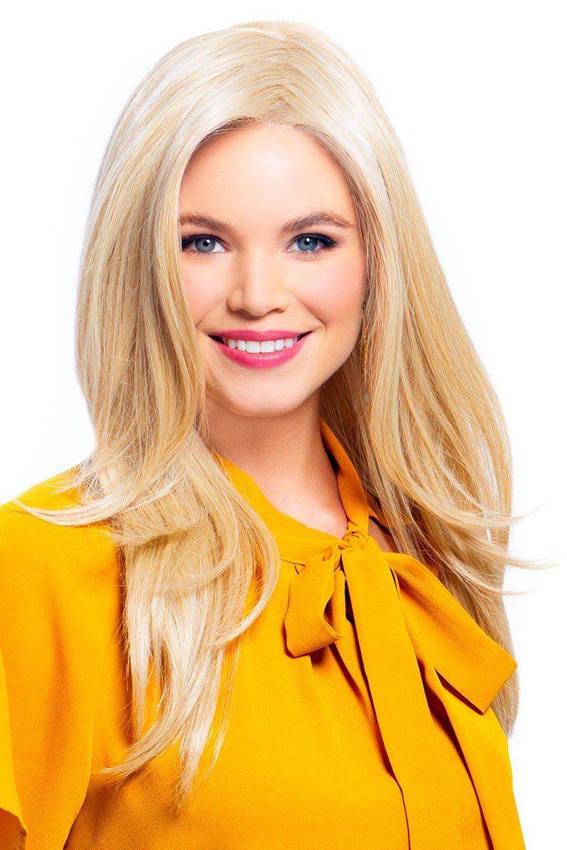 Sensational part-anywhere face framing bangs graduate into feathered layers that fall to the mid back. A Sheer Comfort cap with a hand knotted soft monofilament mesh and ear to ear lace front designed for an undetectable hair line. All day. every-day comfort and the styling versatility to brush back off the face and even pull your hair into a pony-tail.