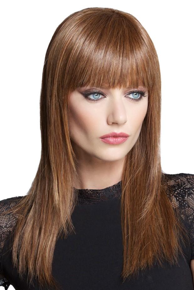 Sleek and Straight features precision cut layers that fall below the shoulder with feathery blunt cut bangs. Circular knotting. a monofilament mesh crown and our Cool Comfort Stretch back. top off this extraordinarily light. natural looking stunning style. Made from TressAllure's own synthetic Style-Able Effortless Fiber™ developed to match the same thickness and weight as fine human hair.