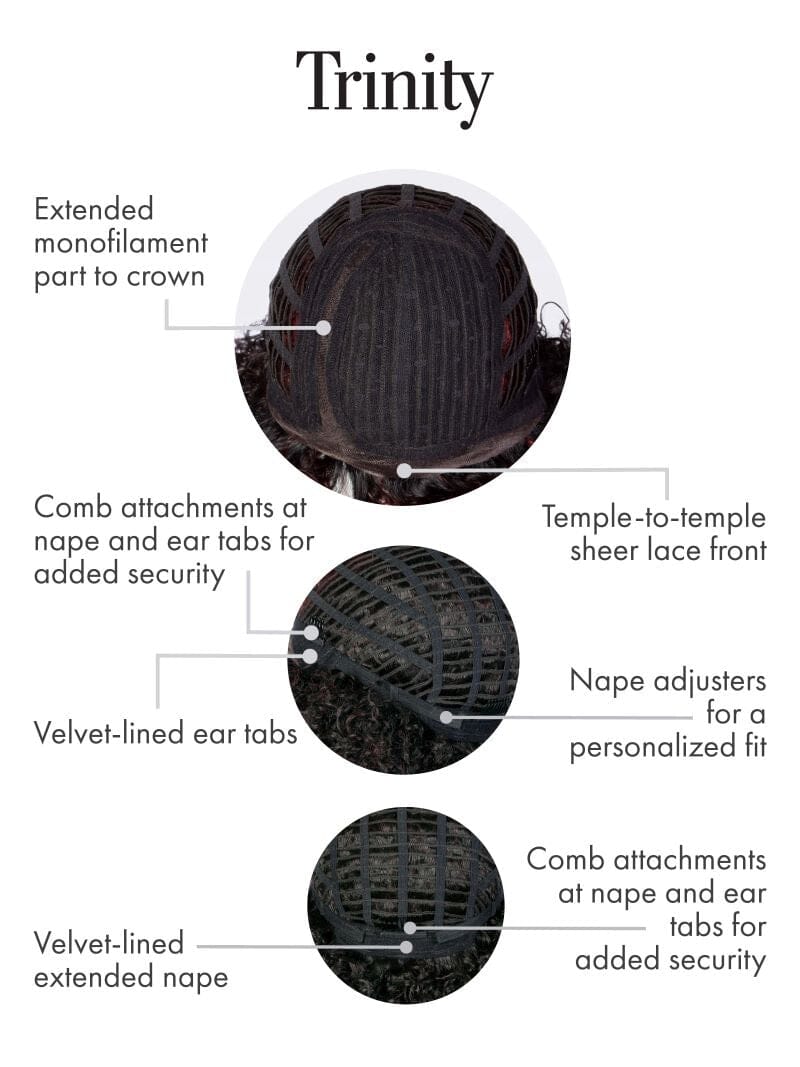 Get ready to get your groove on with TRINITY. This voluminous crown of coiled curls has an extreme. off-center parting to let you express your individuality with pride. The full rounded shape plays a starring role for evening looks or anytime you crave statement-making style.