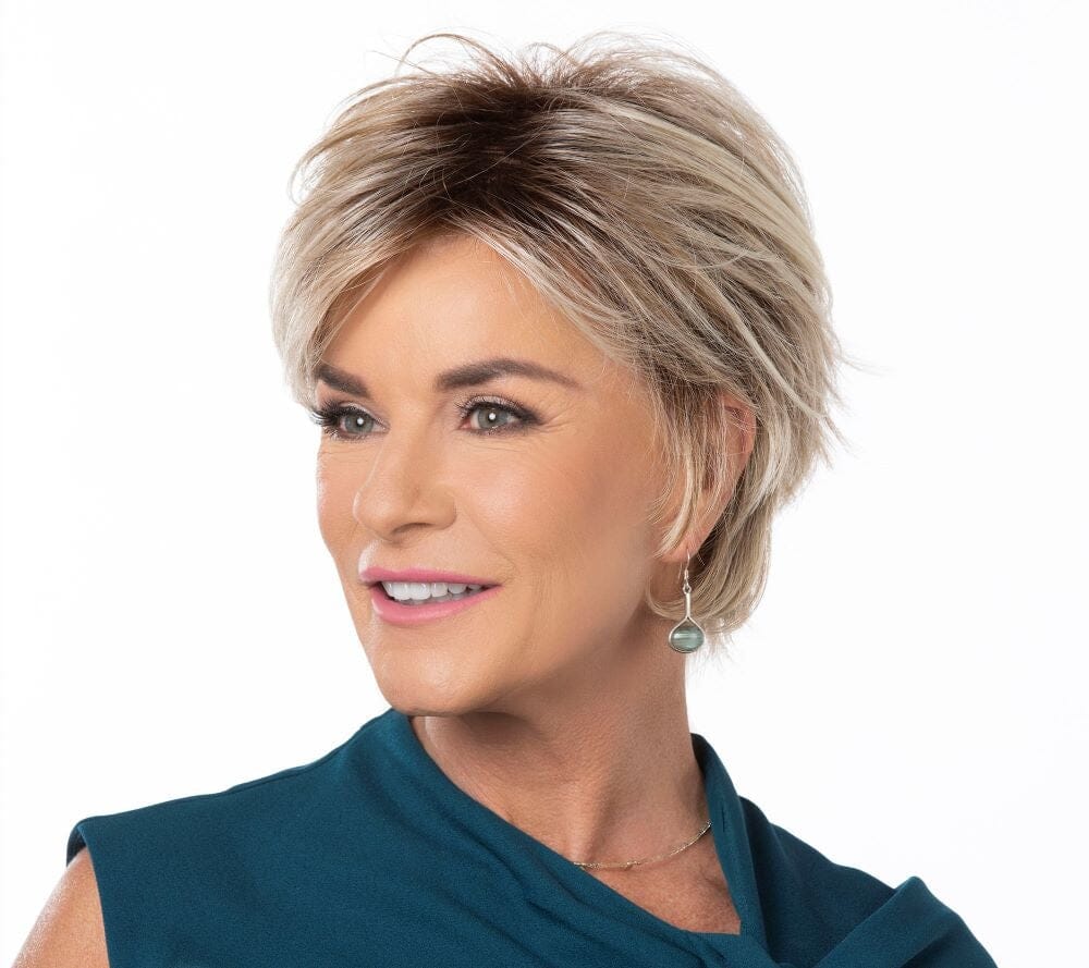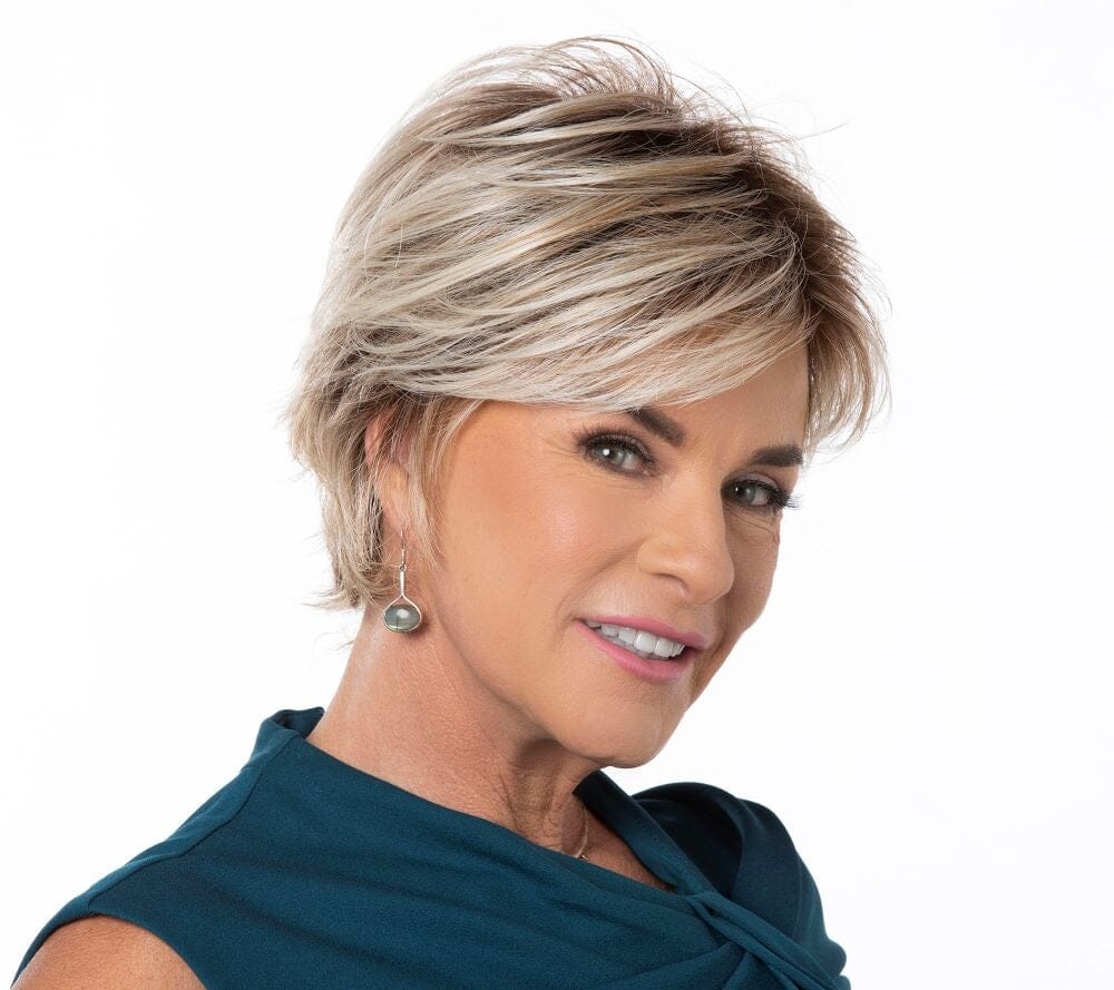 Styled forward to frame your face or brushed back behind the ears for a more sophisticated look. the Toni Brattin Whimsical wig features allover textured layering and a fashionable soft bang. A specially designed wig cap can be easily adjusted for a custom fit. Additional comfort features include a wide velvet band at the front hairline. open wefting on top. and adjustable sizing tabs in the neckline for a comfortable and secure fit. All Toni Brattin wigs have the look and feel of natural hair.